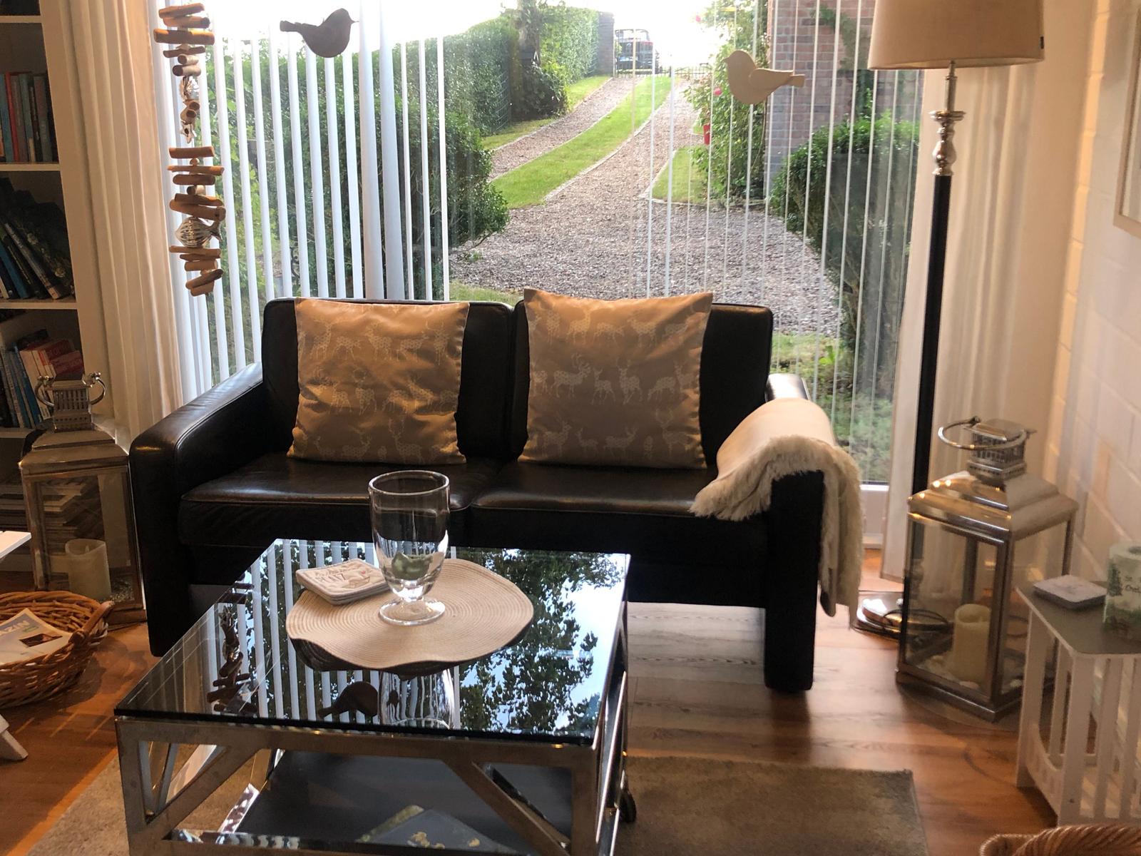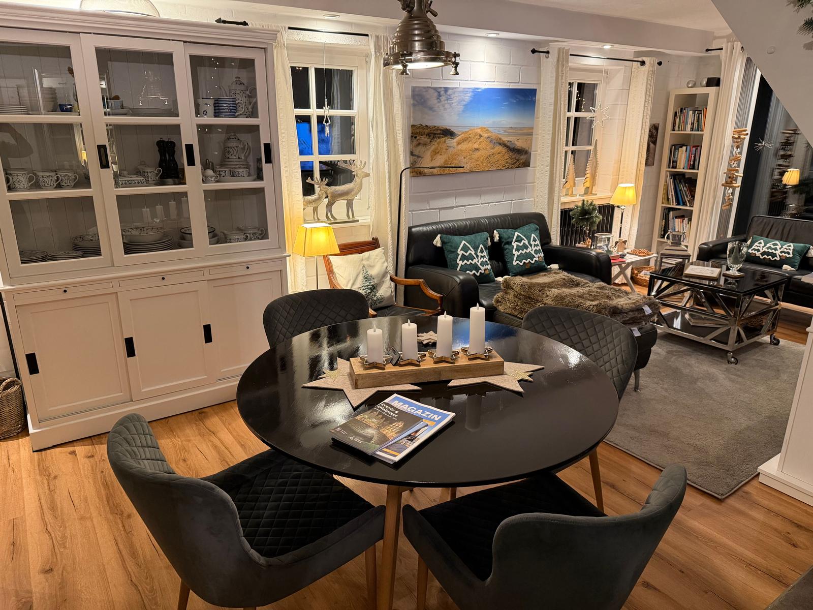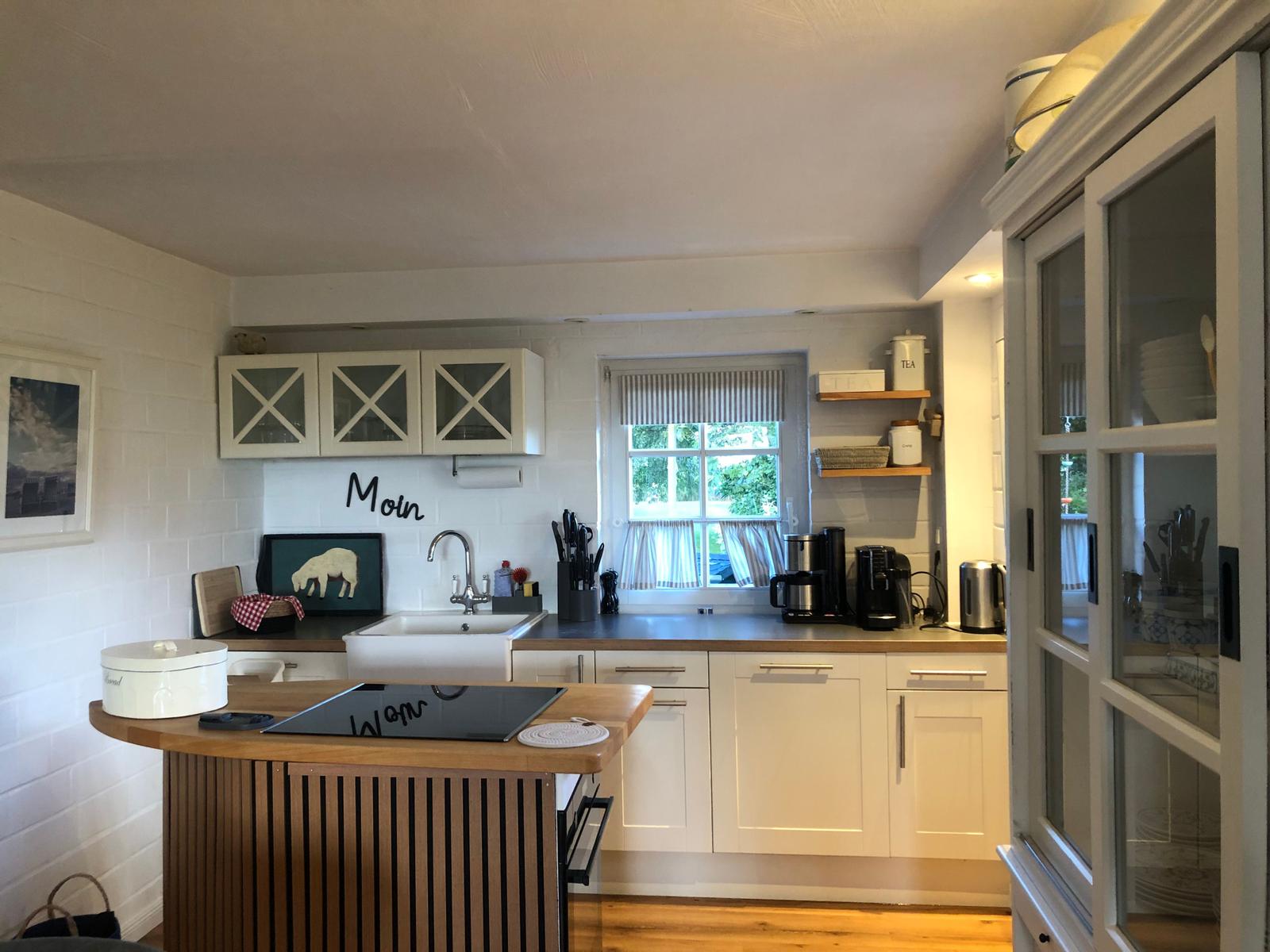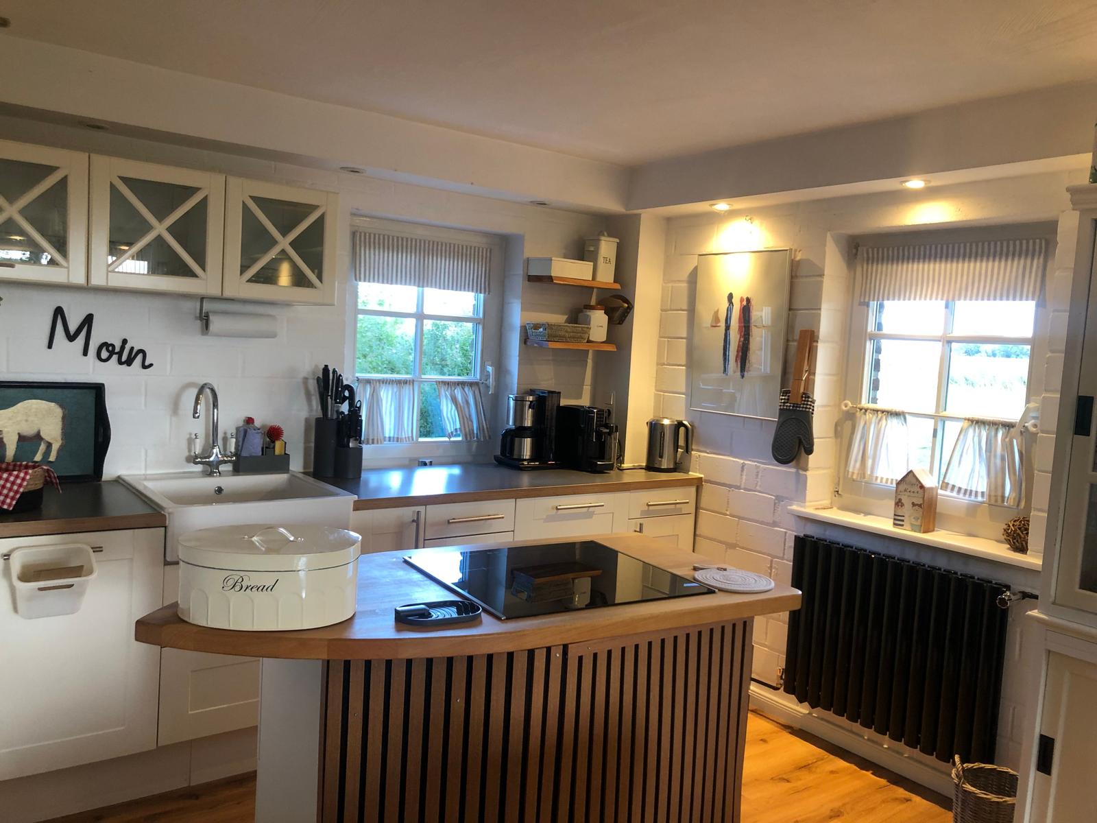 Eingangsbereich mit Klöntüre, offener Flur - Küchen & Essbereich, Einbauküche mit Kochinsel ,Wohnraum hell und freundlich in maritimer Ausstattung , zwei Sofas, laden zur Ruhe und Entspannung ein;