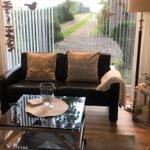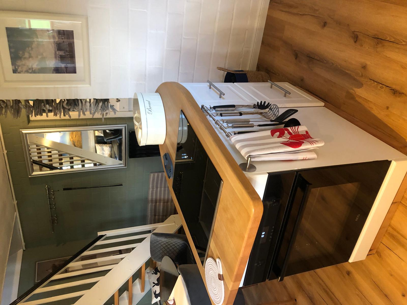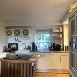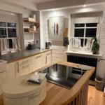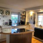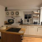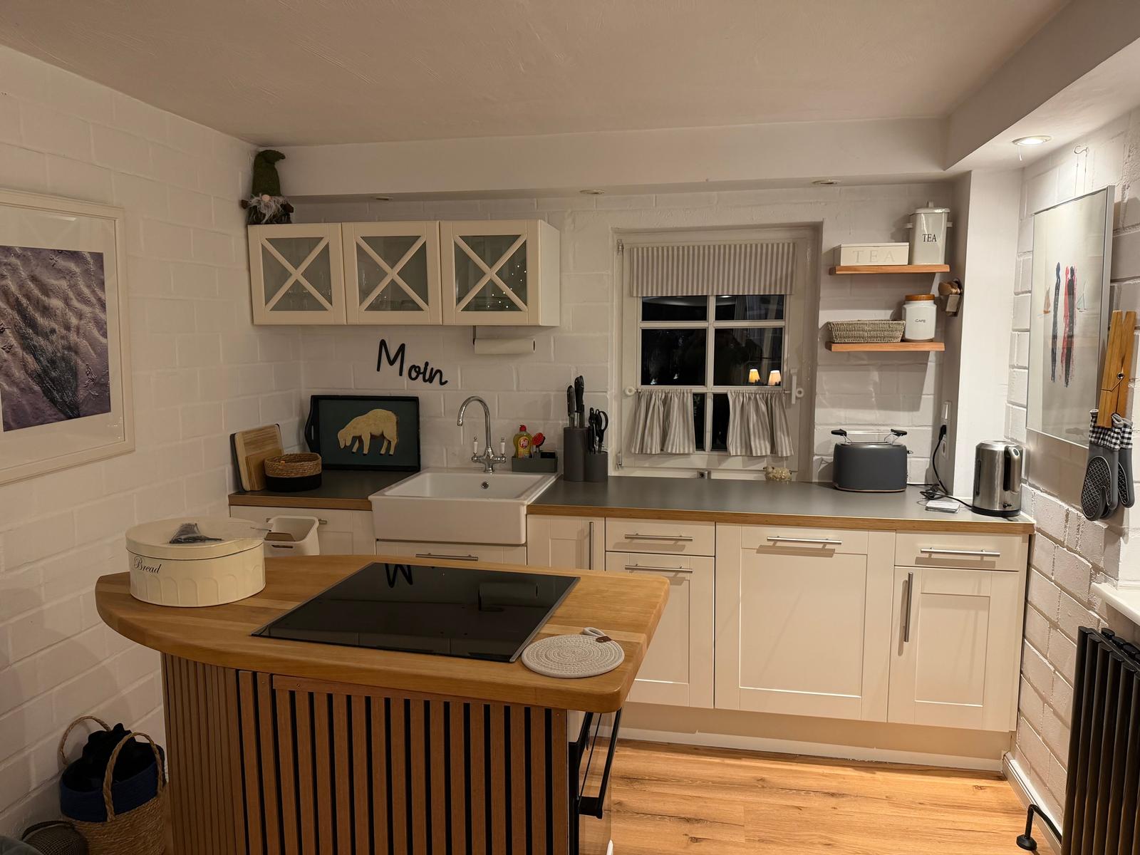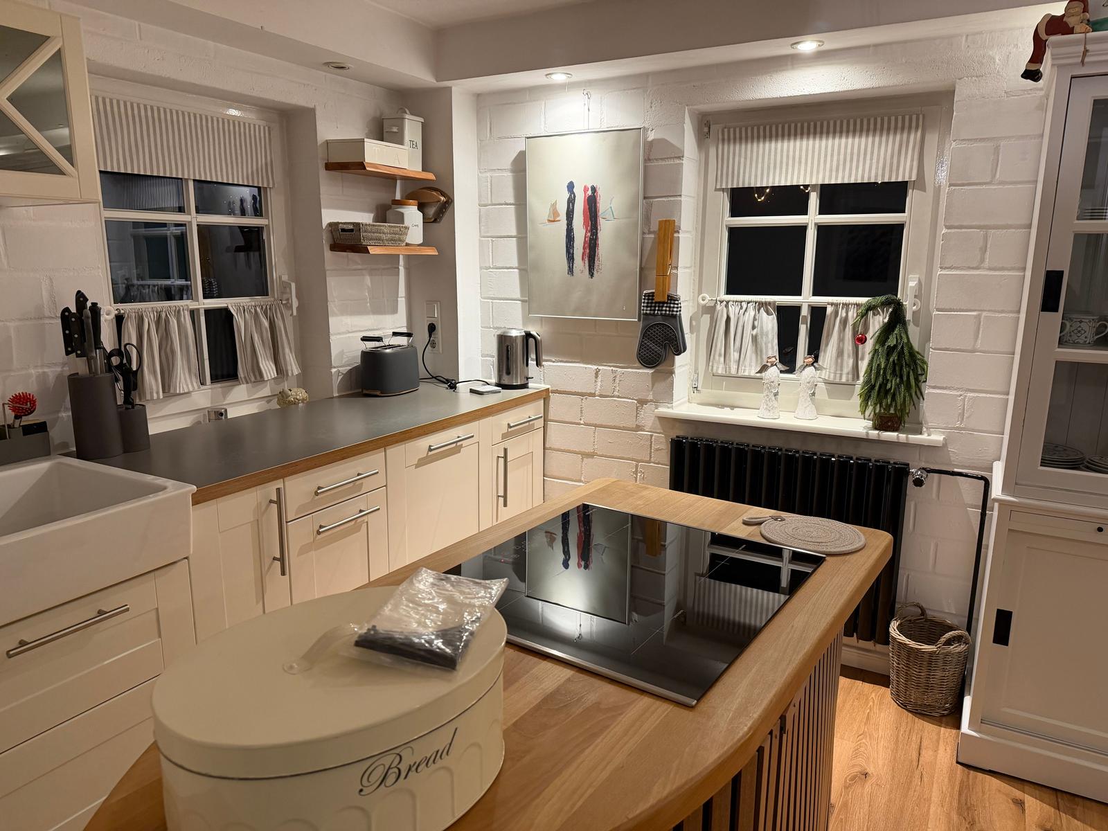 Eingangsbereich mit Klöntüre, offener Flur - Küchen & Essbereich, Einbauküche mit Kochinsel ,Wohnraum hell und freundlich in maritimer Ausstattung , zwei Sofas, laden zur Ruhe und Entspannung ein;