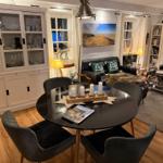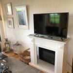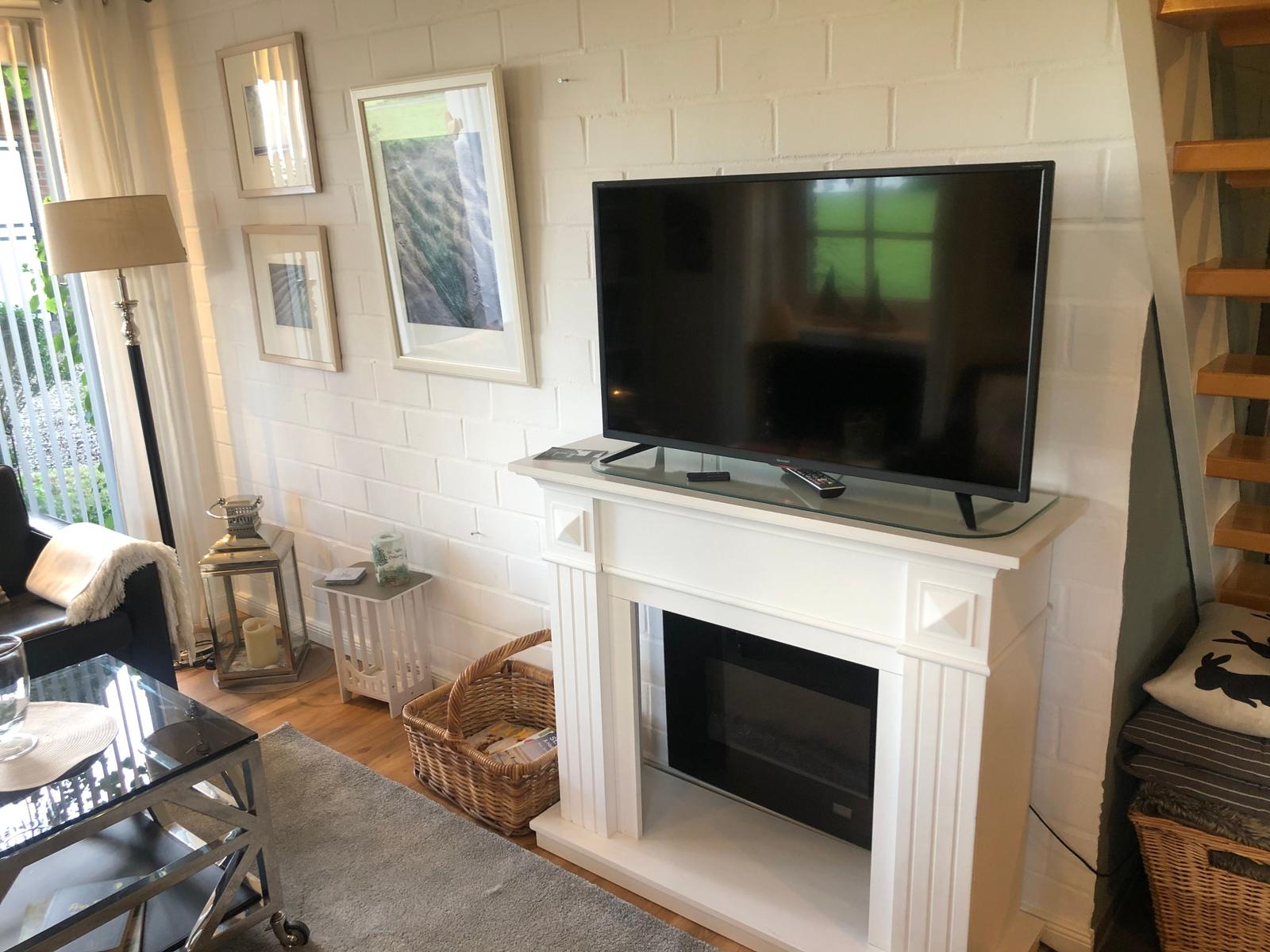 Das elektrische Kaminfeuer sorgt zusätzlich für eine gemütliche Atmosphäre.