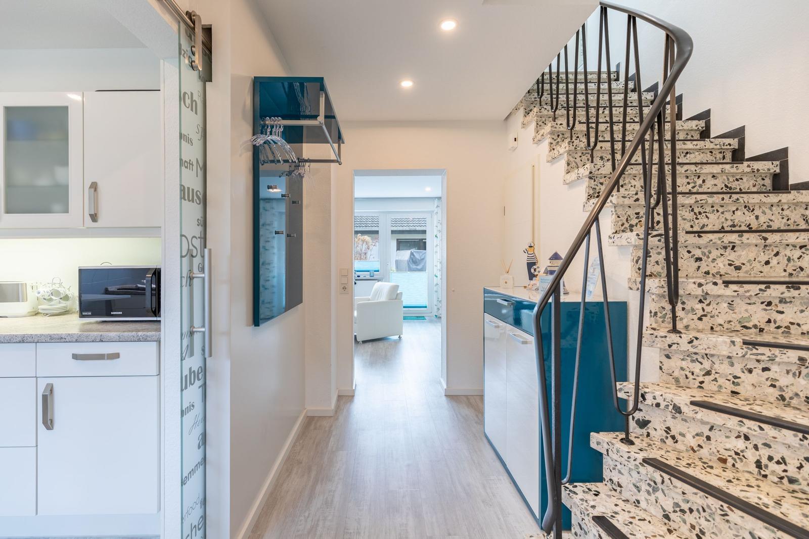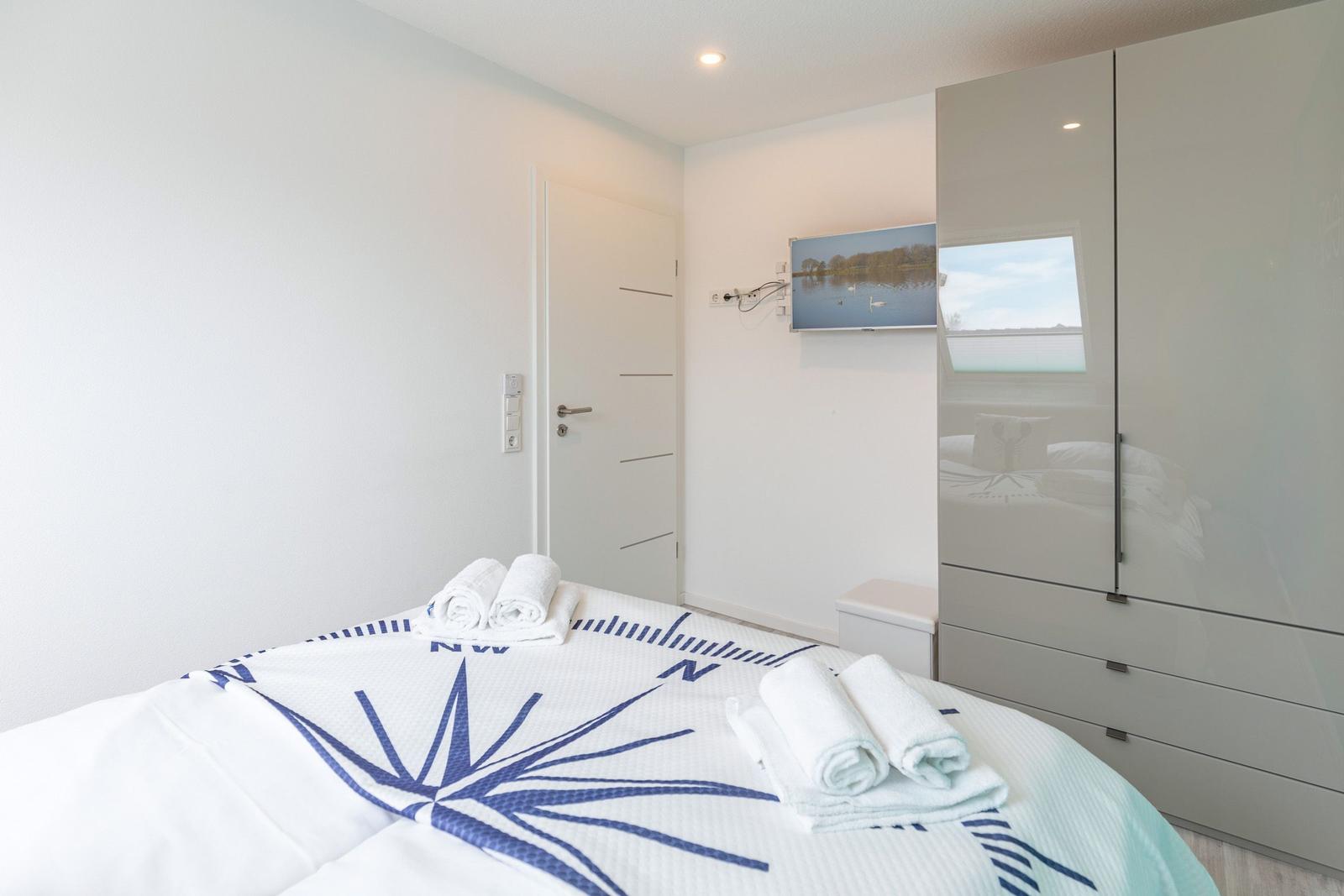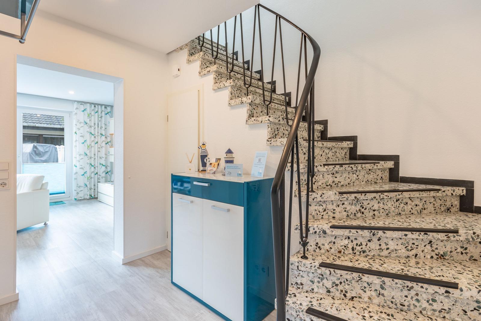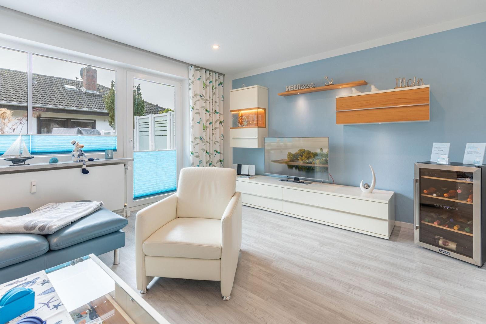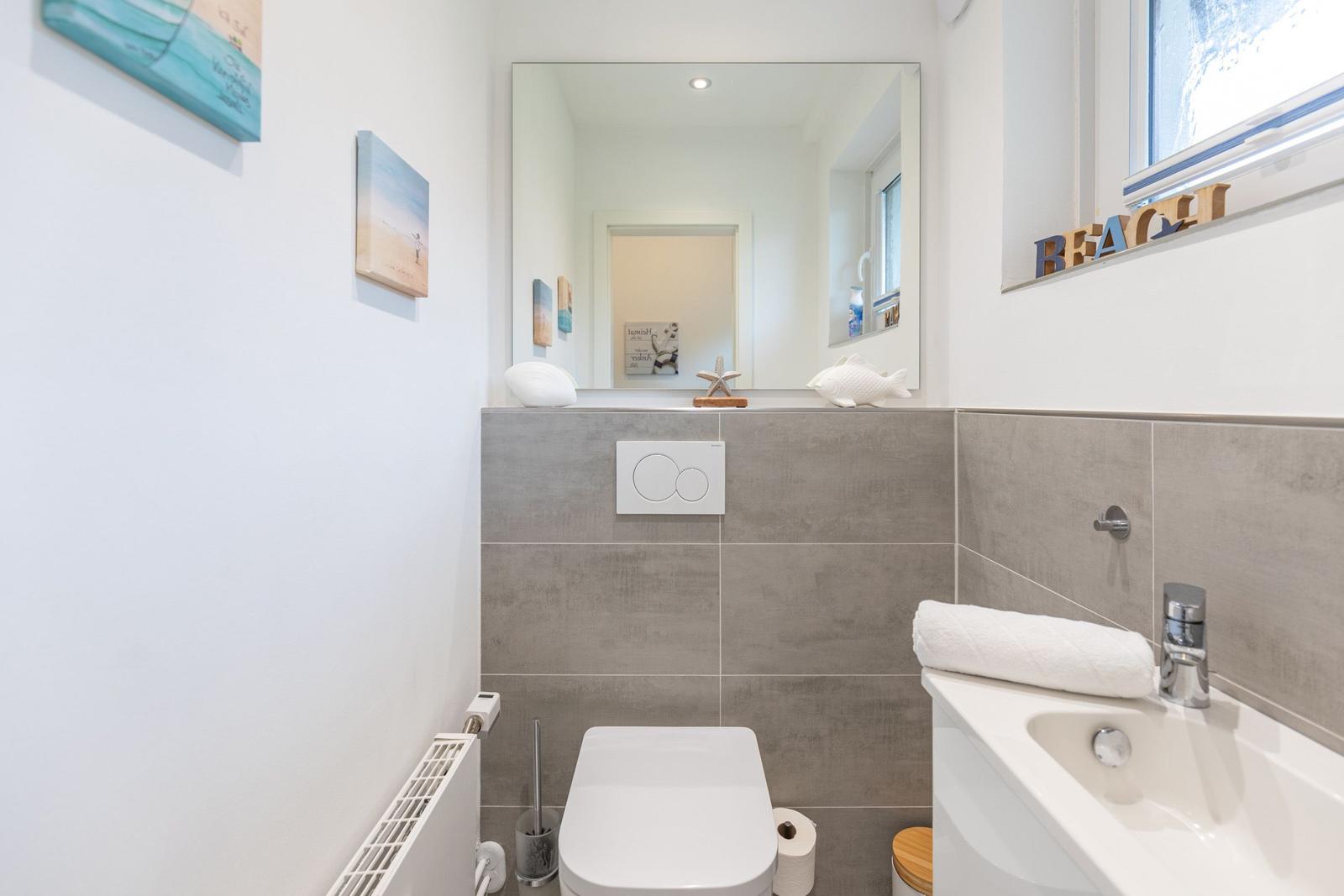 Das Ferienhaus Bellaeins in Tönning erstreckt sich über 75 m² und bietet modernen Komfort für bis zu vier Personen auf zwei Etagen. Es verfügt über zwei gemütliche Schlafzimmer mit Doppelbetten und Fernseher, ideal für Familien oder Paare. Der einladende Wohnbereich ist mit bequemem Sofa, Sessel, SAT-Fernseher und einer HiFi-Anlage ausgestattet. Die voll ausgestattete, geschlossene Küche ermöglicht die Zubereitung von Mahlzeiten und schließt einen angrenzenden Essbereich ein. Das helle Badezimmer im ersten Obergeschoss bietet Dusche, WC und Waschtisch. Zusätzlich sorgt ein Gäste-WC für erhöhten Komfort. Zur Ausstattung gehören Fußbodenheizung, WLAN sowie praktische Haushaltsgeräte wie Waschmaschine und Trockner. Ein Safe und Rauchmelder erhöhen die Sicherheit. Das Nichtraucherhaus vereint hochwertige Materialien und moderne Technik für einen angenehmen Aufenthalt.