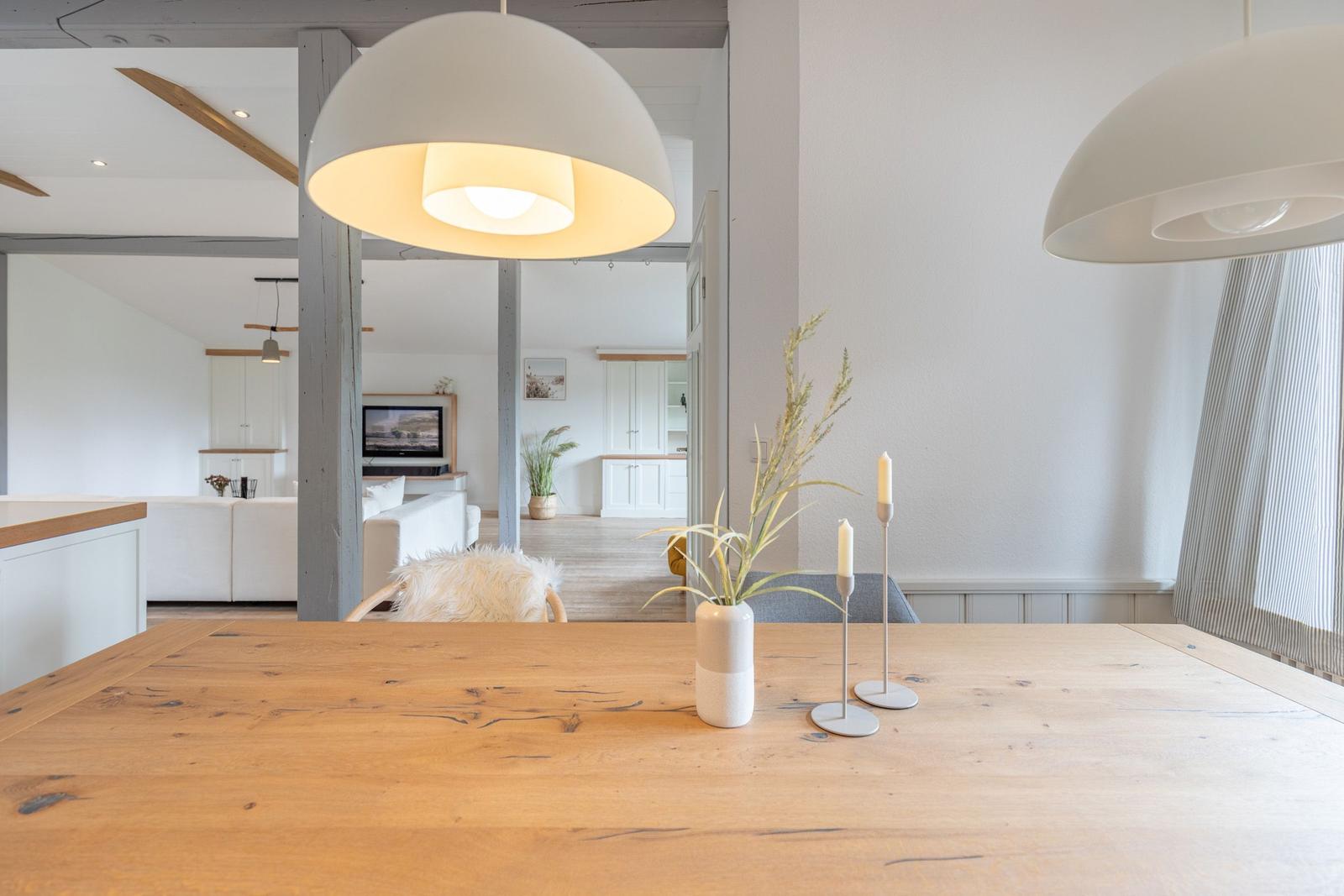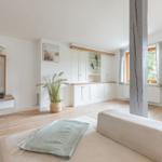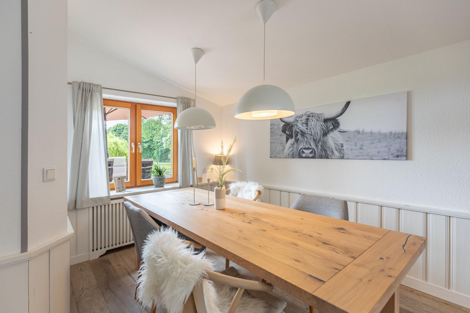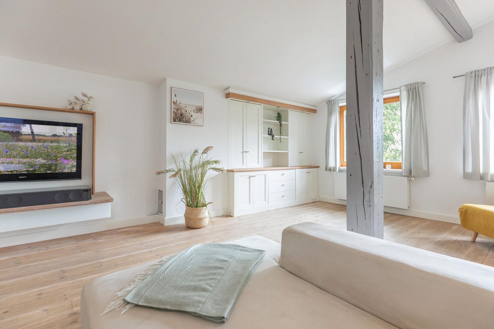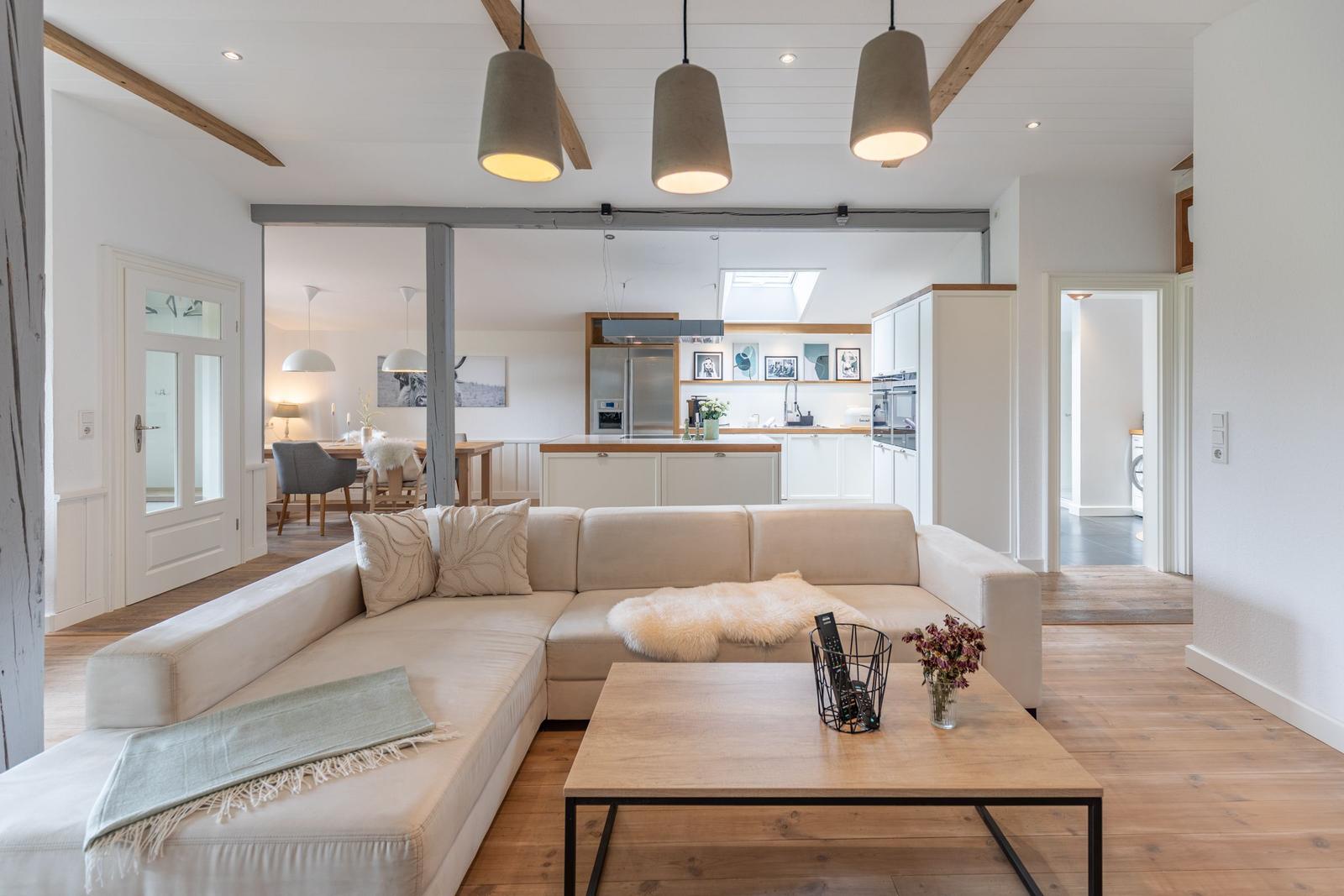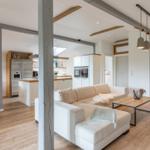 Für zusätzlichen Komfort sorgt die Klimaanlage und die WLAN-Verbindung mit 100 MBit/s. Das Wohnzimmer bietet Platz zum Entspannen mit einem Sofa, einem Sessel und einer HiFi-Anlage. Ein Esstisch ermöglicht gesellige Mahlzeiten.