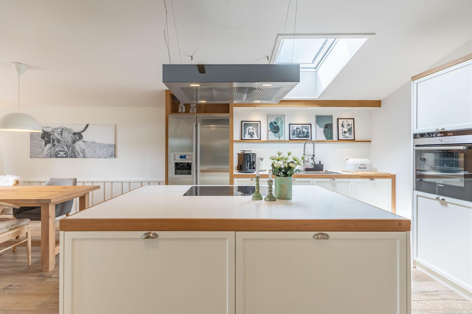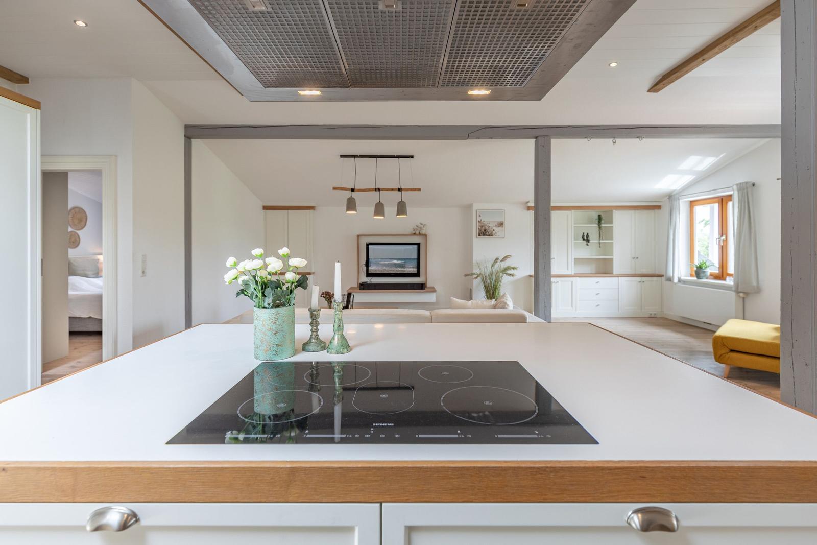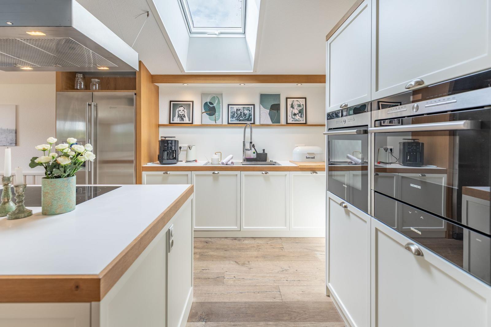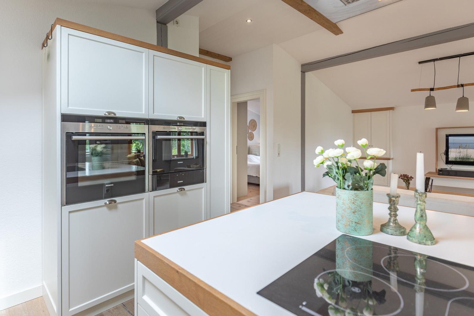 Die gut ausgestattete Küche verfügt über einen Elektro-/Gasherd, Backofen, Geschirrspüler, Mikrowelle, Kühlschrank, Gefriermöglichkeit, Kaffeemaschine und einen Toaster. Ein Kinderhochstuhl sowie Geschirr und Besteck sind ebenfalls vorhanden.
