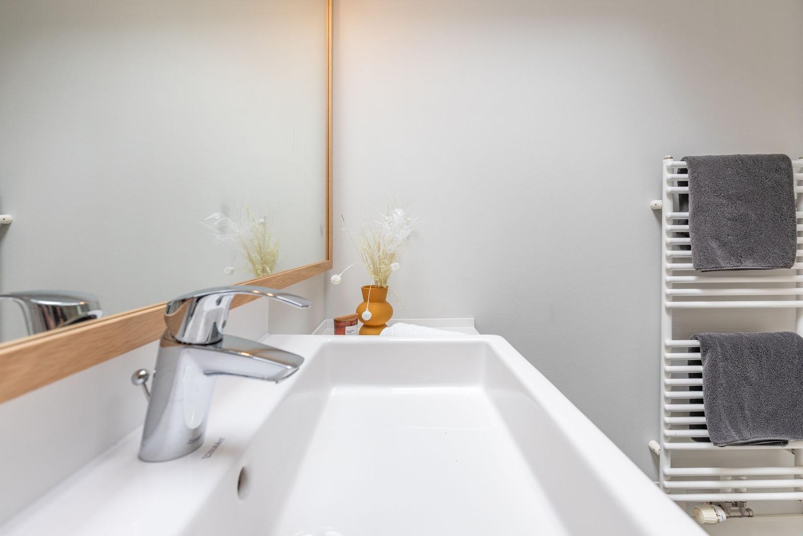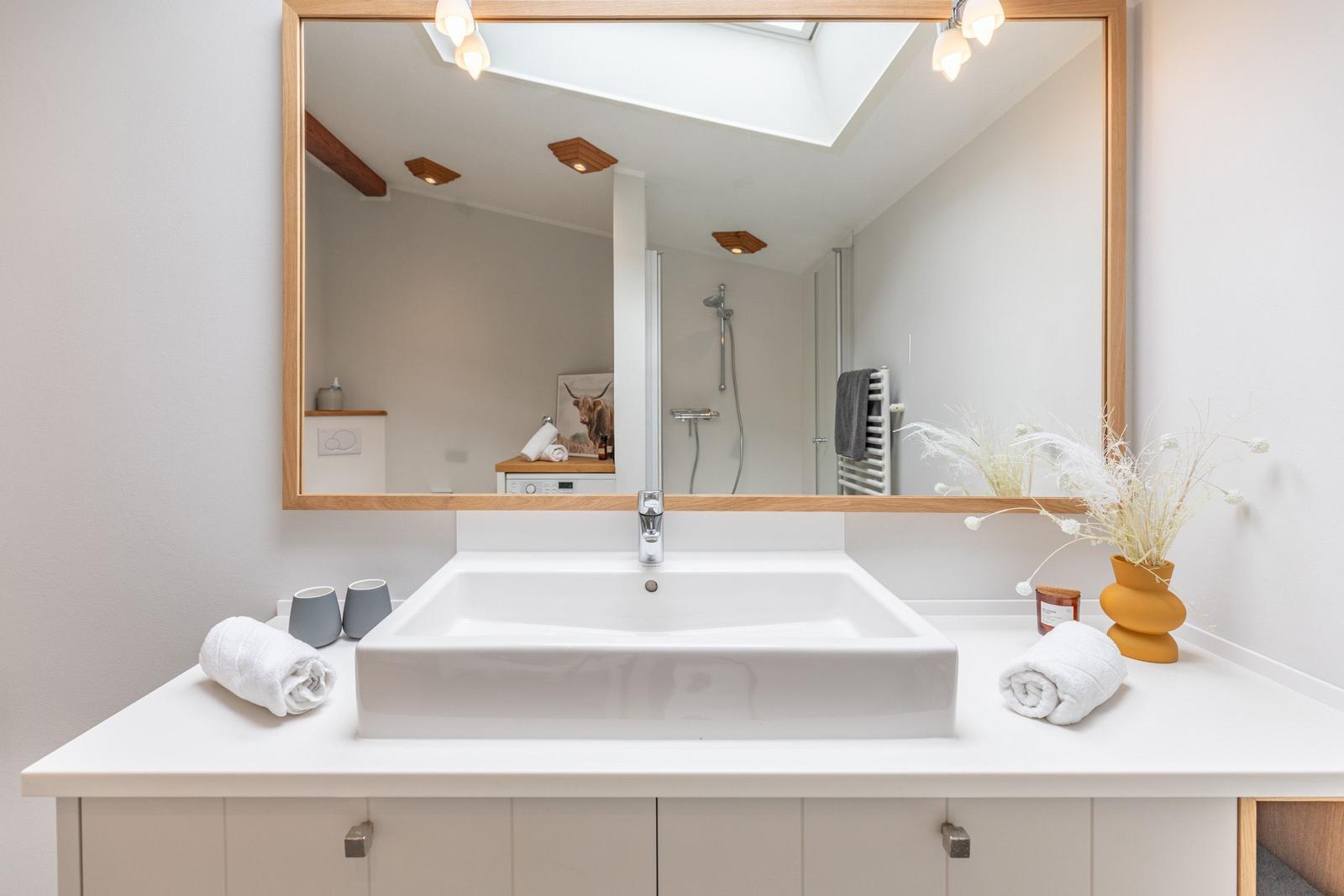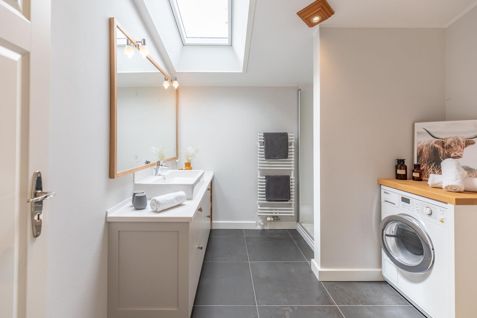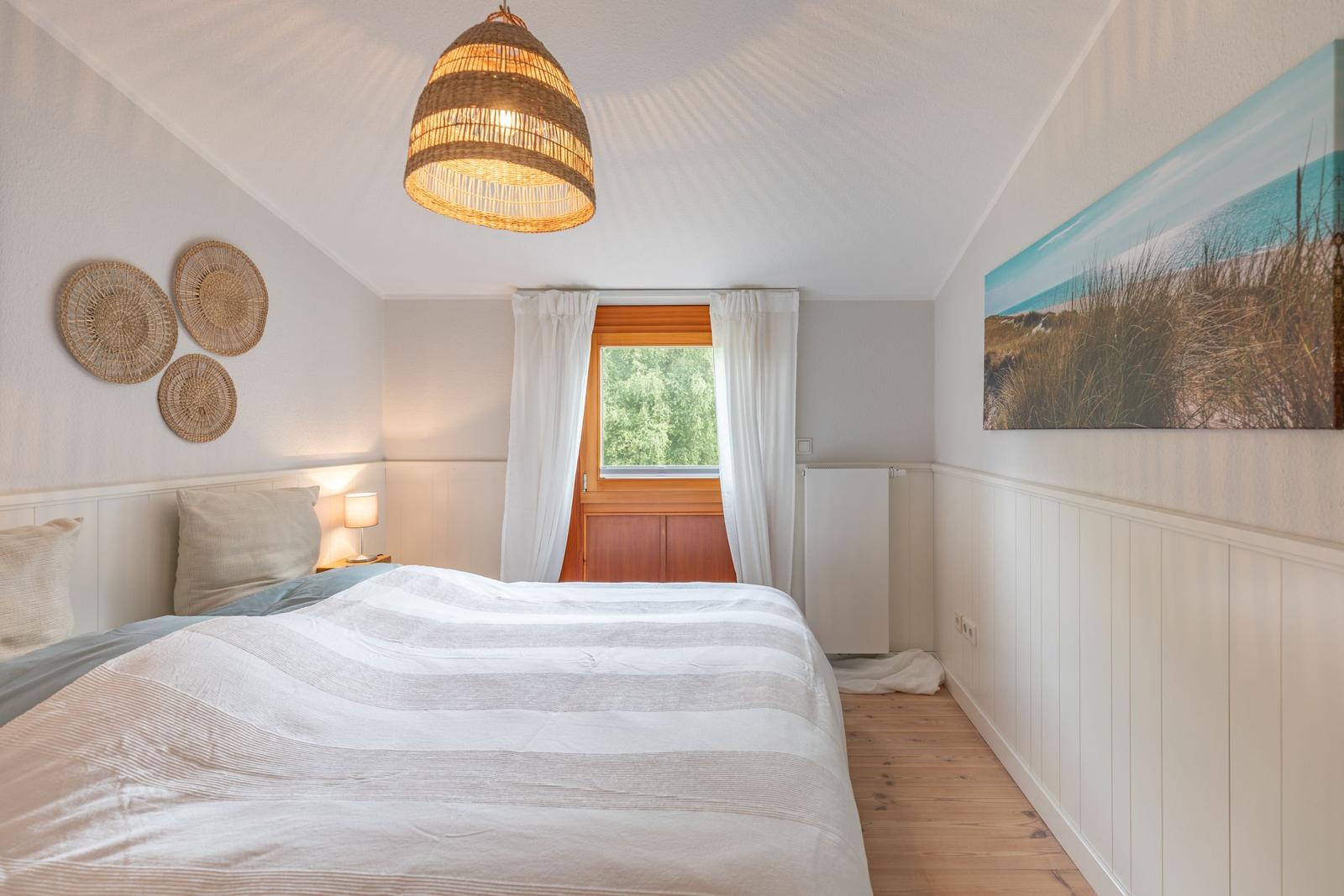 Diese Ferienwohnung bietet einen komfortablen Rückzugsort für Erholungssuchende. Sie umfasst ein Schlafzimmer mit einem gemütlichen Doppelbett, ein modernes Badezimmer mit Fenster und Duschbad sowie Fußbodenheizung.