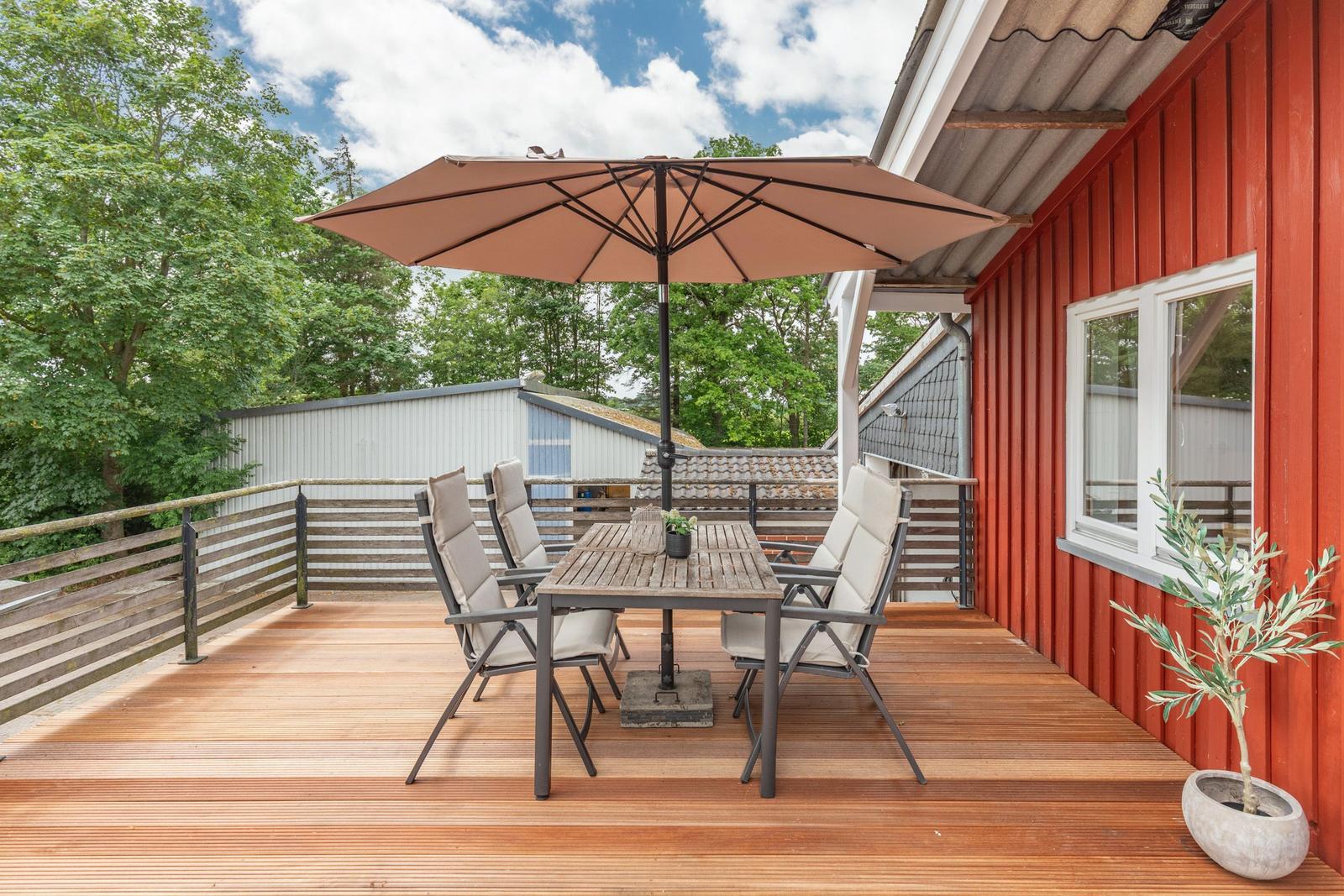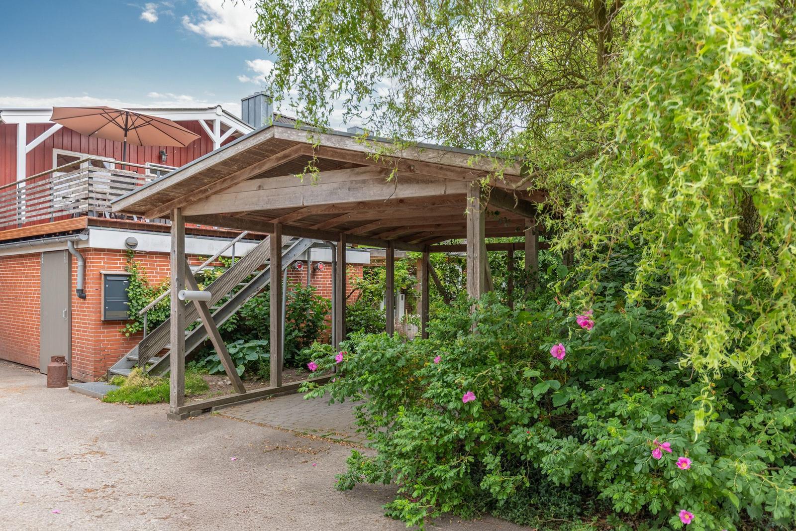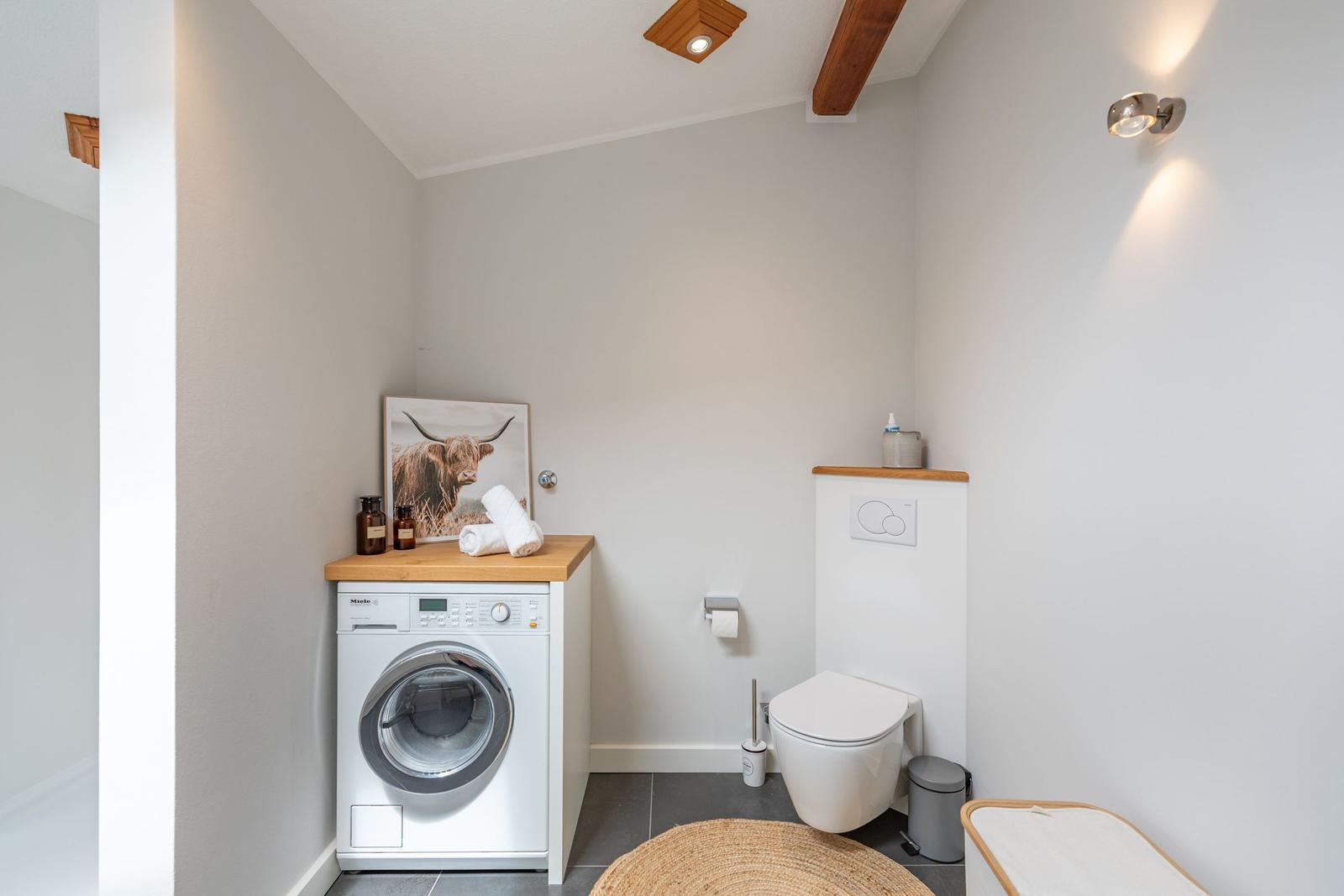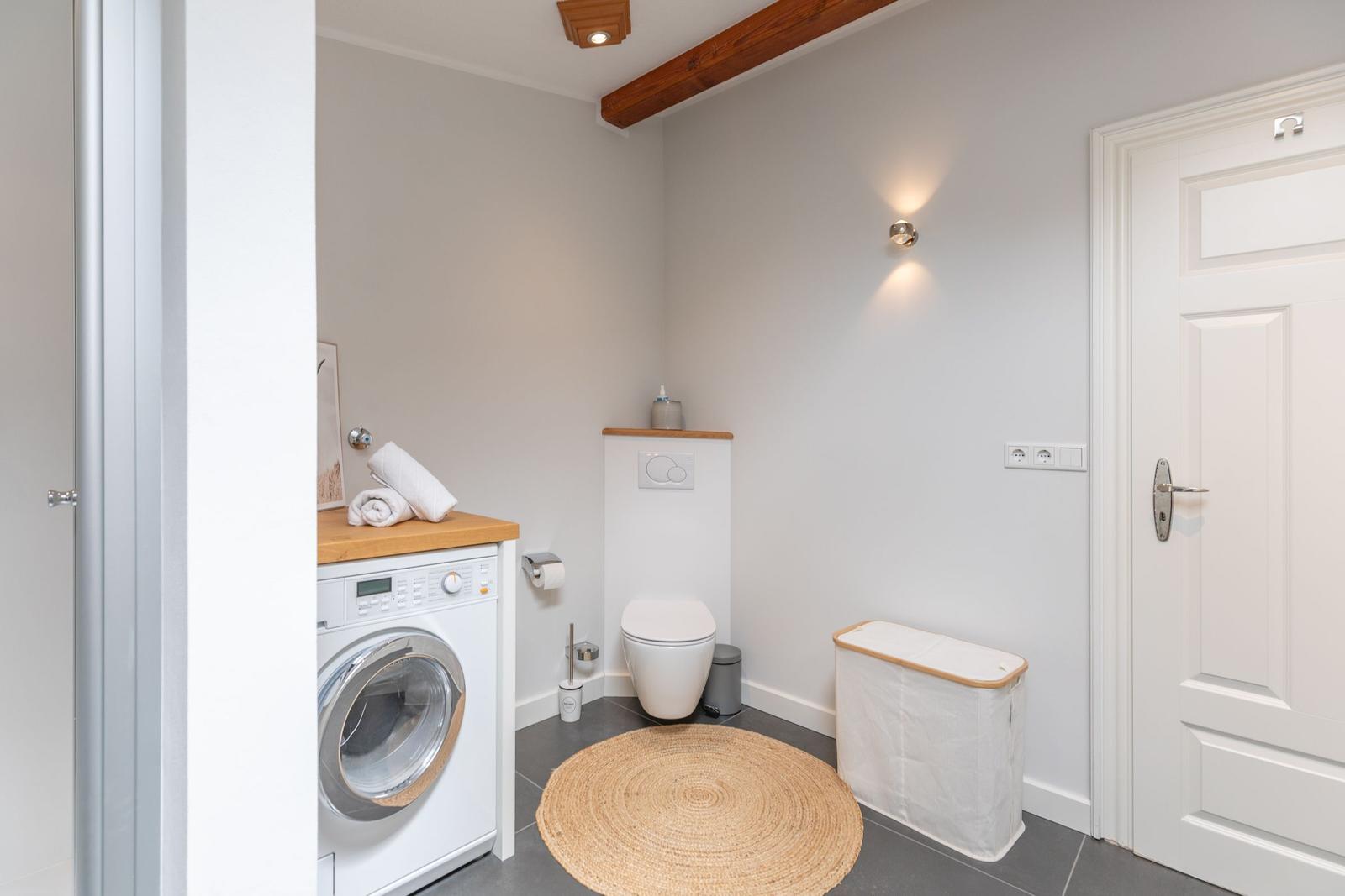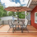 Praktische Annehmlichkeiten wie Waschmaschine, Wäschetrockner, Parkplatz und Staubsauger runden das Angebot ab. Der Außenbereich bietet mit einem Sonnenschirm und Fliegengittern zusätzlichen Komfort für angenehme Stunden.
