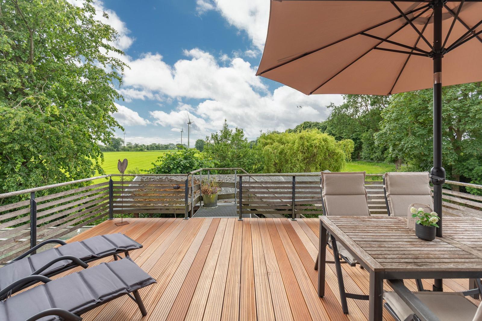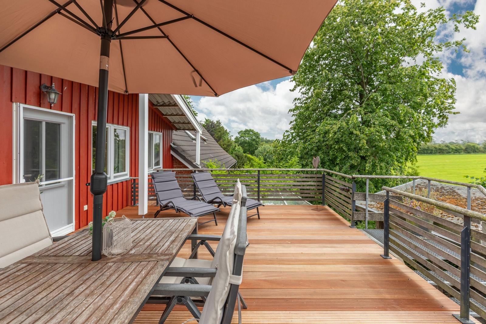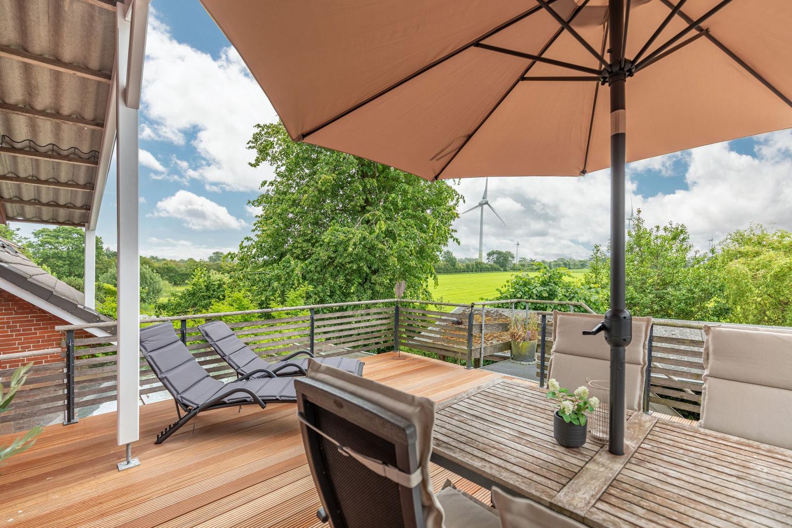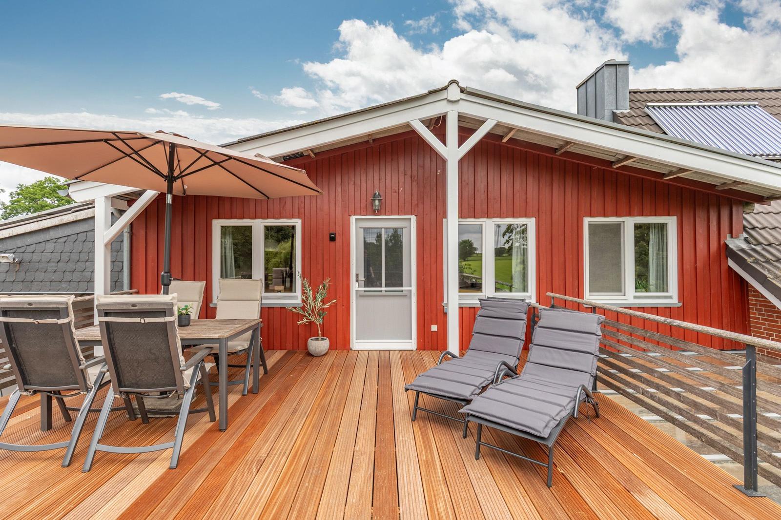 Praktische Annehmlichkeiten wie Waschmaschine, Wäschetrockner, Parkplatz und Staubsauger runden das Angebot ab. Der Außenbereich bietet mit einem Sonnenschirm und Fliegengittern zusätzlichen Komfort für angenehme Stunden.