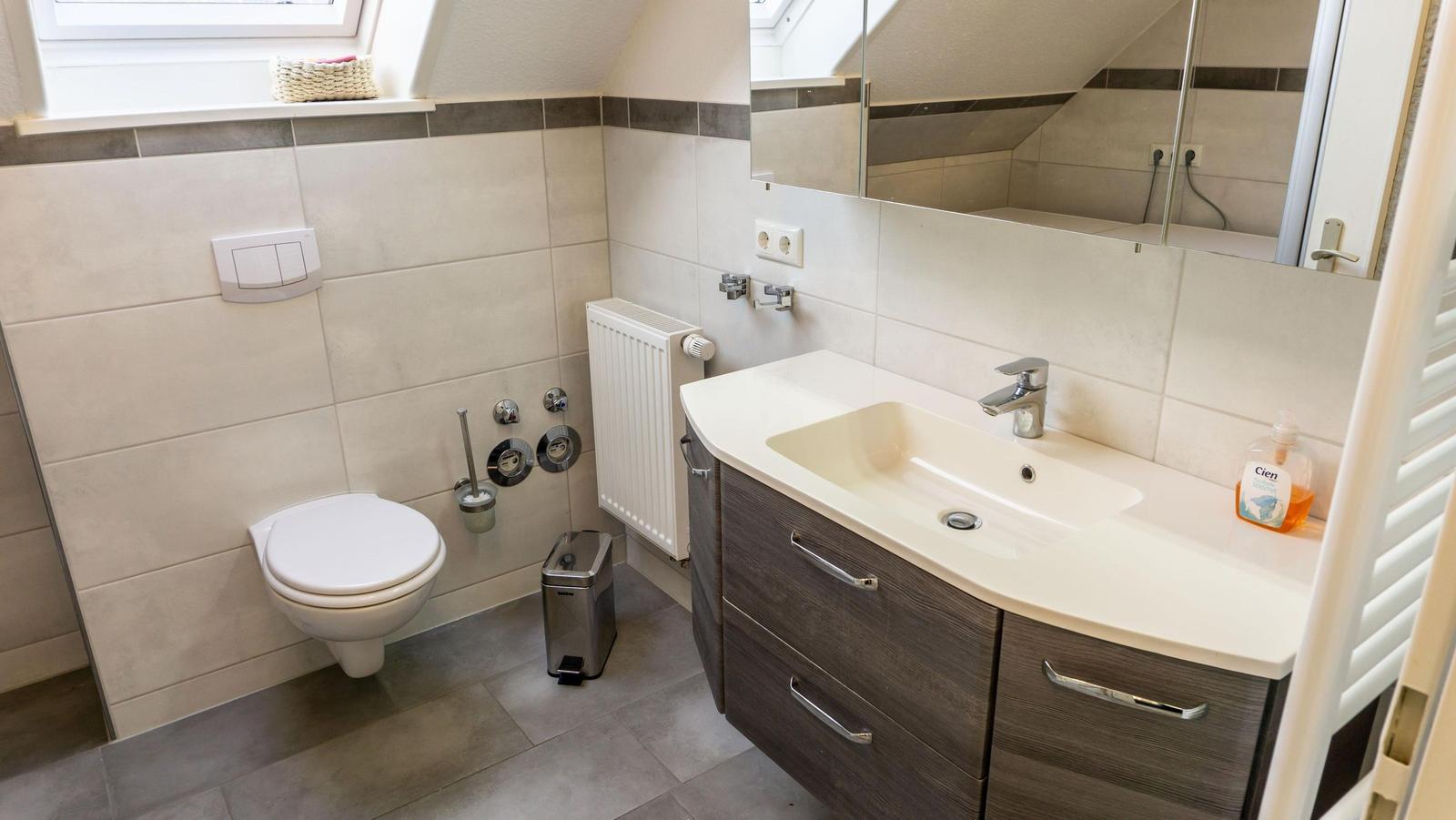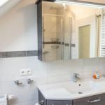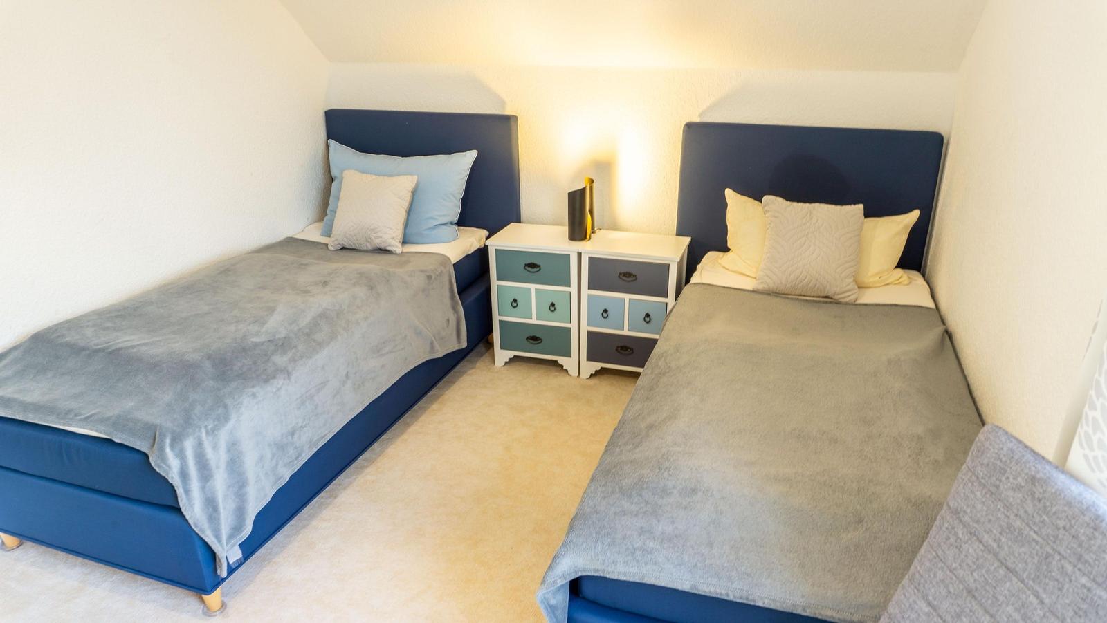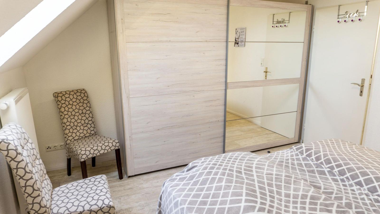 Die Ferienwohnung „Bi Moni un Willi“ bietet auf 75 m² ausreichend Platz für bis zu sechs Personen und ist ideal für Familien und Paare. Die Wohnung verfügt über drei separate Schlafzimmer, darunter ein Einzelzimmer, das über ein weiteres Schlafzimmer zugänglich ist. Der Wohnbereich ist ausgestattet mit einer gemütlichen Sofaecke und einem über 55 Zoll großen Fernseher. Die geschlossene Küche beinhaltet einen Esstisch sowie eine umfassende Ausstattung, darunter Ceranherd, Backofen, Kühlschrank mit Gefrierfach, Mikrowelle und Spülmaschine. Das moderne Badezimmer bietet eine bodengleiche Dusche und ist mit einem Haartrockner sowie einem Fenster für Tageslicht ausgestattet. WLAN, eine Waschmaschine und ein Trockner stehen zur Verfügung. Ein Safe im Schlafzimmer und verschiedene Haushaltsgeräte sorgen für zusätzlichen Komfort. Ein Privatparkplatz befindet sich direkt am Haus.