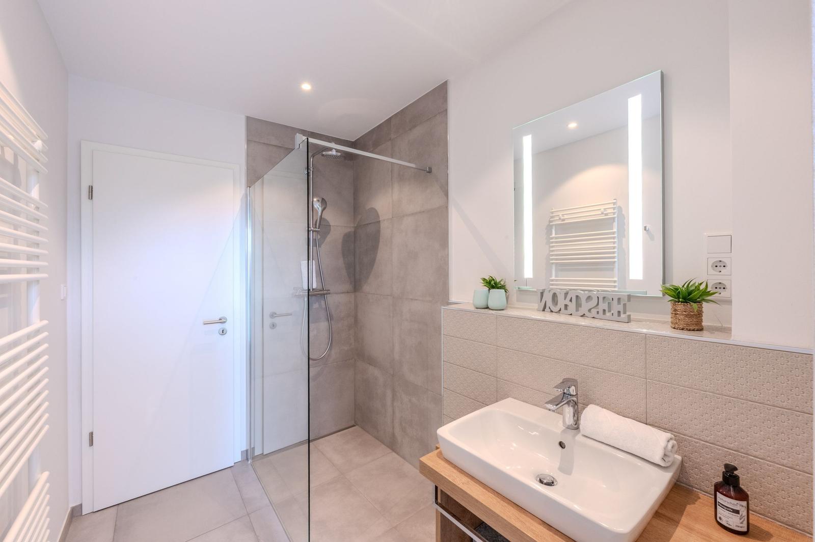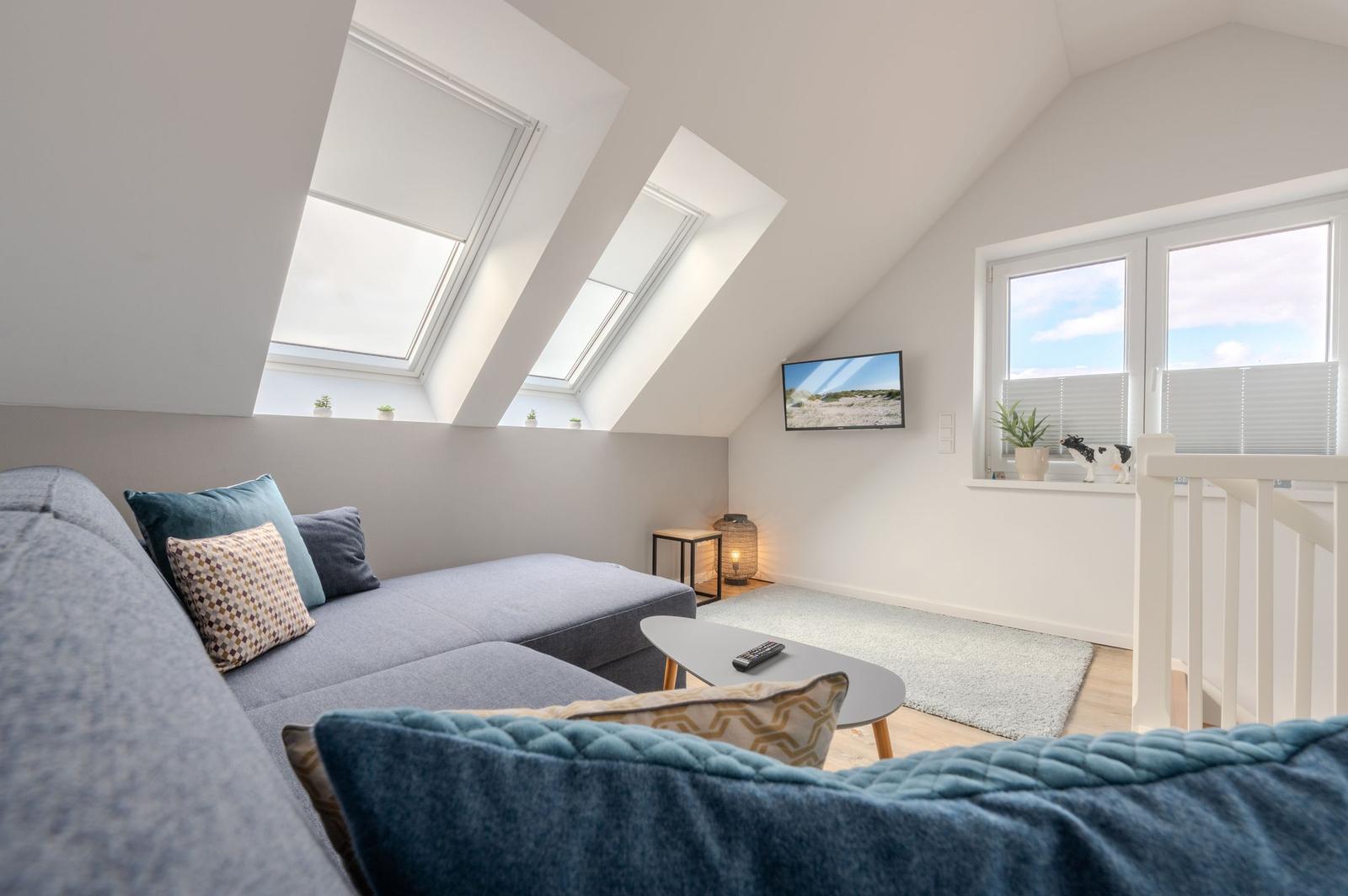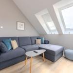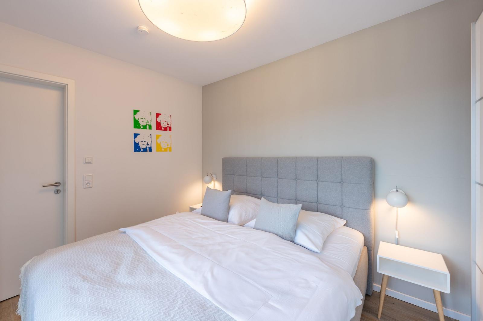 Die Ferienwohnung bietet ein modernes, helles Ambiente mit durchdachter Raumaufteilung. Sie verfügt über ein komfortables Schlafzimmer mit einem Doppelbett und einem Einzelbett, ideal für Familien oder Paare. Die offene Küche ist mit einem Elektro-/Gasherd, Geschirrspüler, Backofen, Mikrowelle, Kühlschrank und Kaffeemaschine ausgestattet. Ein Kinderhochstuhl, Toaster und Mixer stehen ebenfalls bereit, um den Aufenthalt angenehm zu gestalten.