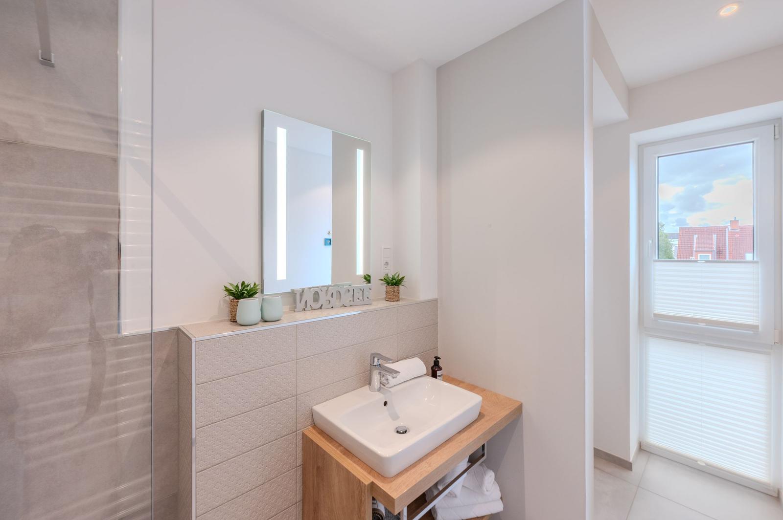 Das Badezimmer mit Fenster bietet eine Dusche, einen Haartrockner und Fußbodenheizung. Für das technische Wohlbefinden sorgt die HiFi-Anlage sowie ein TV. WLAN ist verfügbar. Ein Parkplatz und ein Fahrstuhl sind ebenfalls vorhanden. Zudem gibt es eine Waschmaschine und einen Wäschetrockner für einen sorgenfreien Aufenthalt. Kinderspielzeug und eine Garderobe runden das Angebot ab, sodass sich Gäste in dieser einladenden Ferienwohnung sofort wohlfühlen können.